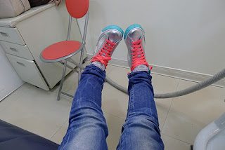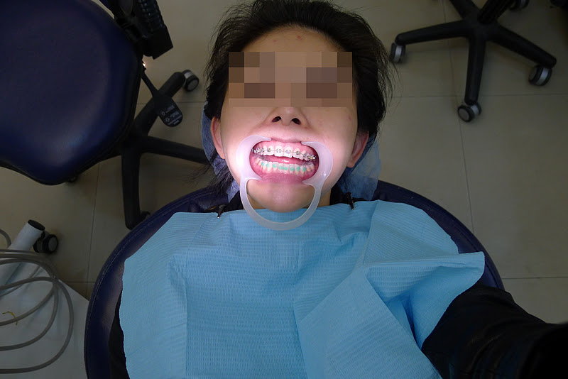 今天醫師幫凱姊換了彩色橡皮筋歐, 把之前透明的已經被咖哩染成螢光黃的橡皮筋換掉.