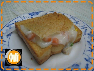 ❷厚片吐司炸到金黃,中間挖空放入勾芡陷料,再放上土司的蓋子即成為美味可口的棺材板.