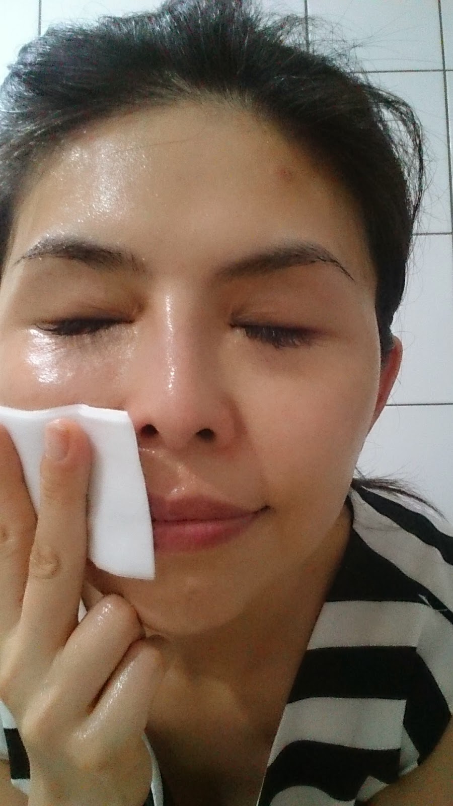 卸妝棉的質感是油的, 但算能接受. 輕輕擦拭一下右臉, 不需要太出力, 太用力反而會過度拉扯肌膚歐~